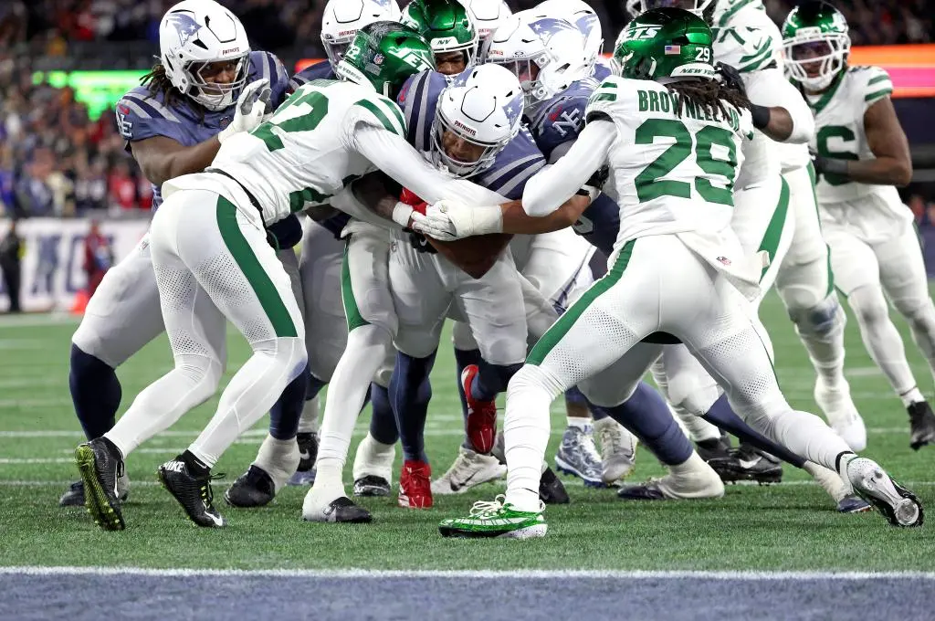 The incident unfolded just minutes after the final whistle at Gillette Stadium, where a rain-soaked field and a raucous Foxborough crowd had witnessed rookie running back TreVeyon Henderson score three touchdowns and quarterback Drake Maye dissect the Jets’ secondary with surgical precision. New England improved to 9-2, extending their winning streak to eight games and solidifying their grip on the AFC East. For the Jets, the defeat marked another low point in a season spiraling toward irrelevance, with quarterback Justin Fields struggling to generate consistent offense and the defense unable to contain New England’s balanced attack.