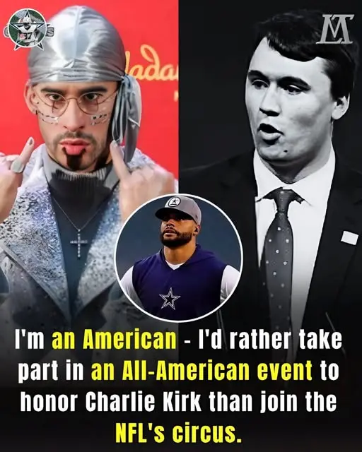 DALLAS, TX —In a development that rocked both the sports and entertainment worlds, Dallas Cowboys quarterbackDak Prescott— known for being calm and reserved — has suddenly become the focus of a new media storm. At a charity fundraising Q&A event in Arlington, Prescott announced that hewill boycott this year’s Super Bowlif the NFL still decides to let the Puerto Rican rapperBad Bunnybecame the main artist during the halftime show.