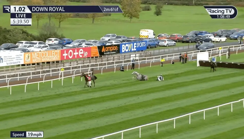 Disaster struck in an instant. Theflyingking stepped awkwardly at the final obstacle, pecking badly on landing and falling heavily. The horse’s momentum carried it tumbling into the path of the pursuing Kazansky, who had also traded at 1.01 moments earlier as second place seemed assured. With nowhere to go, Kazansky collided and unseated Ewing, sending both horse and rider sprawling. The fall was severe enough to prompt immediate veterinary attention, and while Theflyingking and Kennedy emerged unscathed—Kennedy quickly on his feet and the horse reported fine by Elliott—the incident effectively eliminated the top two from contention.