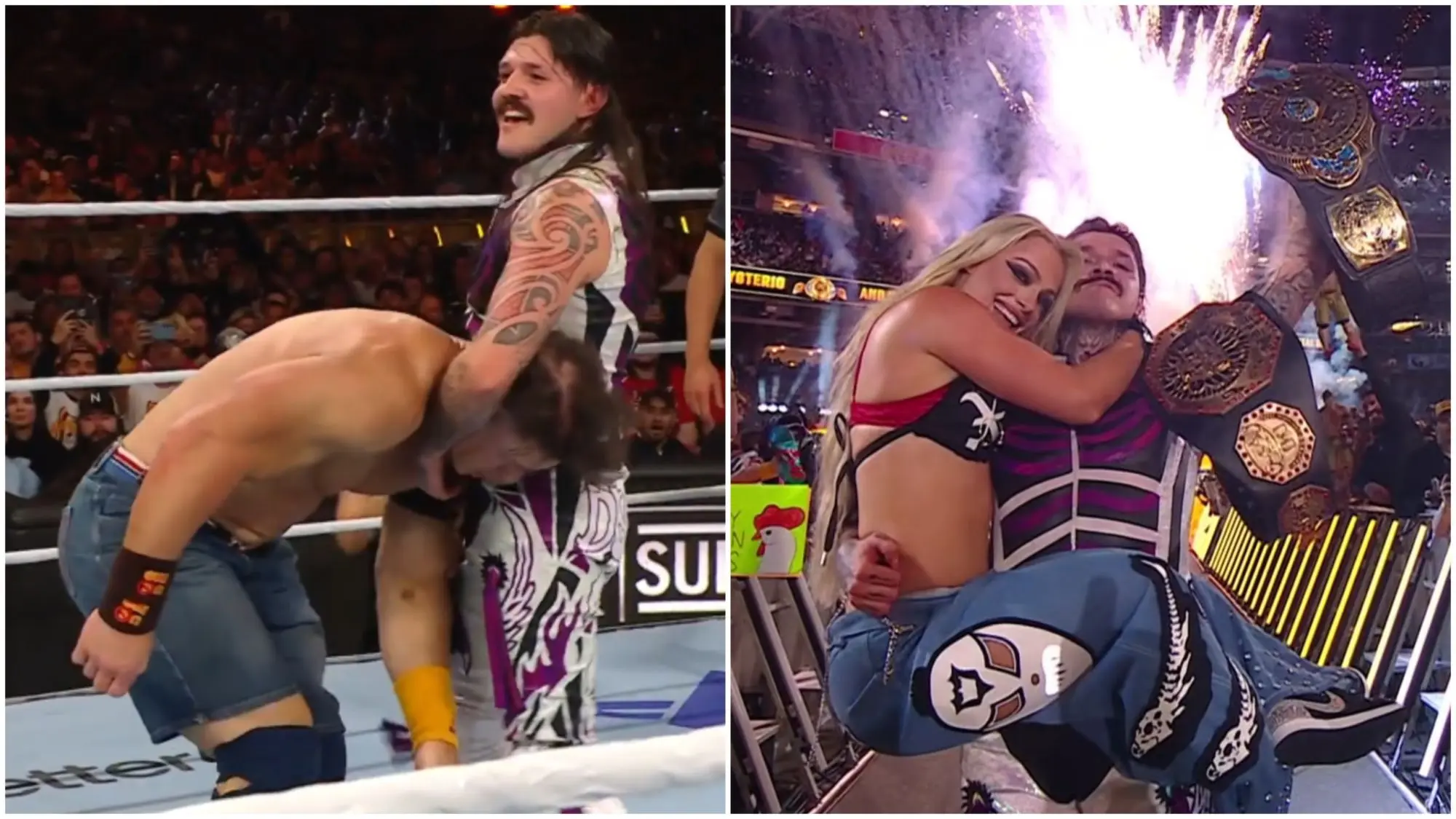 A frog splash followed, Dom’s body arcing through the air like his father Rey in his prime, but Cena’s shoulder stayed up, the near-fall sending shockwaves through the stadium.