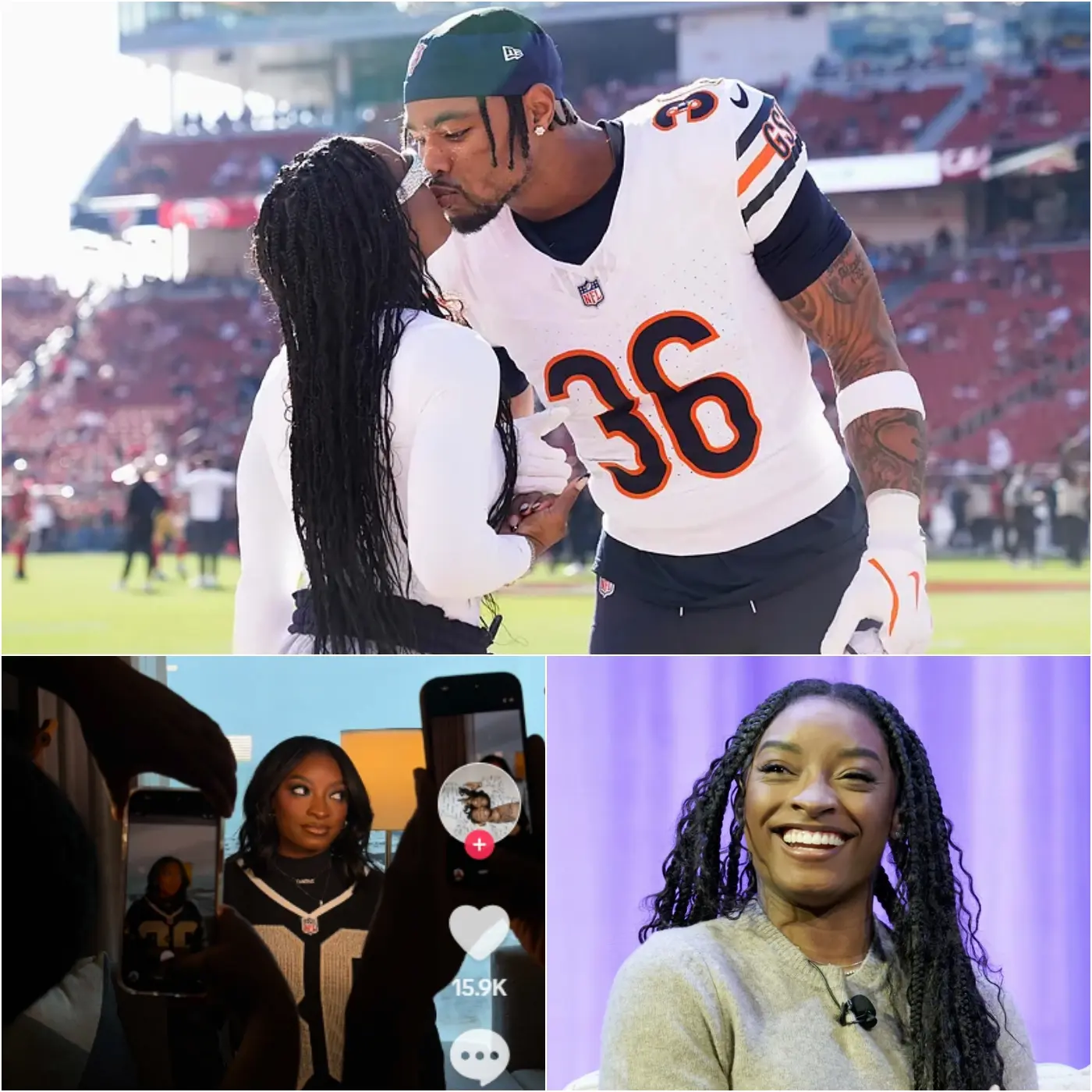 “Look how cute he is,” Biles exclaimed, before the Bears went on to defeat the New York Giants 24-20, with Biles and her friends celebrating the victory and later sharing a meal together.