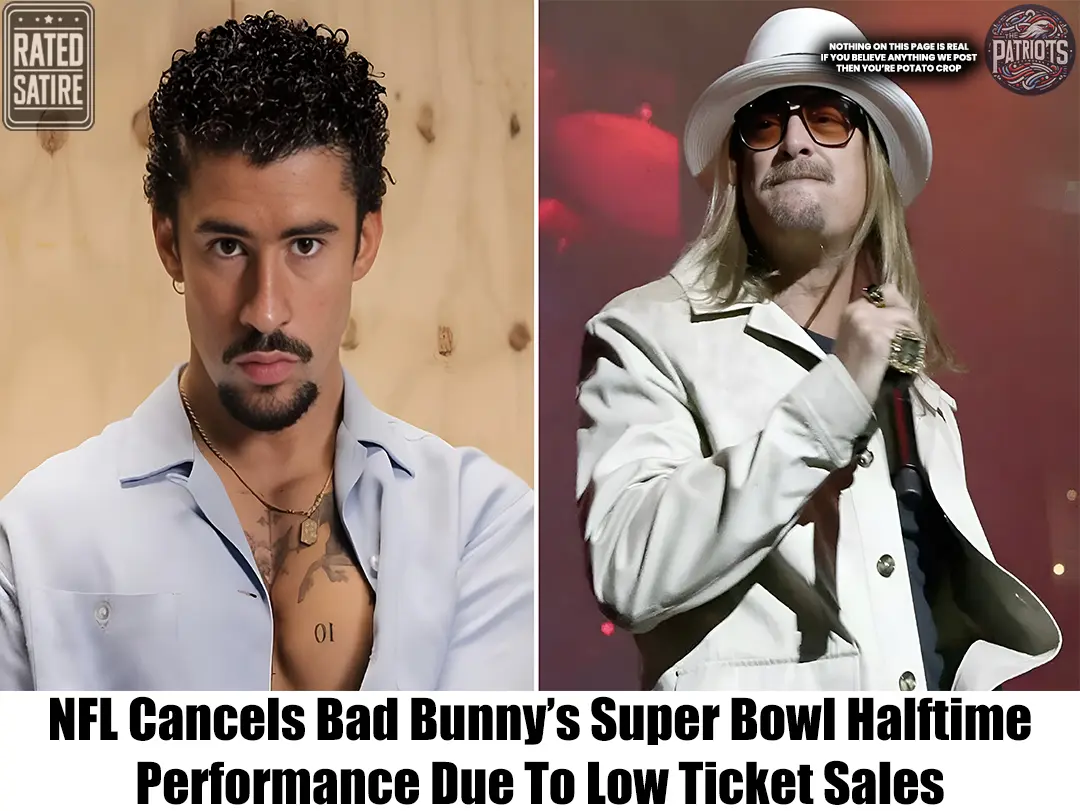 The NFL has reportedly canceled Bad Bunny’s upcoming Super Bowl halftime performance after disappointing ticket sales, announcing, “It’s official — we’re going for Kid Rock.” But Bad Bunny’s reaction is the real spotlight.